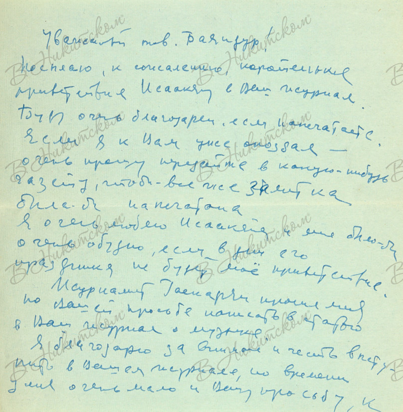 2. Хачатурян, А. [Автограф]. Рукописное письмо к С. Баяндуру. 2 с. 20.10.1955. 18 х 17,5 см. В конверте, прошедшем почту. «Уважаемый тов. Баяндур! Посылаю, к сожалению, коротенькое приветствие Исаакяну в Ваш журнал. Буду очень благодарен, если напечатаете. Если я к Вам уже опоздал - очень прошу передайте в какую-нибудь газету, чтобы все же заметка была бы напечатана. Я очень люблю Исаакяна и мне было бы очень обидно, если в дни его праздника не будет мое приветствие. Исурнамит Гаспарян просил меня по Вашей просьбе написать статью в Ваш журнал о музыке. Я благодарю за внимание и честь выступить в Вашем журнале, но времени у меня очень мало и Вашу просьбу, к сожалению, я удовлетворить не смогу. Предлагаю перепечатать мою статью в журн. „Советская музыка“, в том числе об армянской музыке. Привет А. Хачатурян 20/Х 1955 г.».