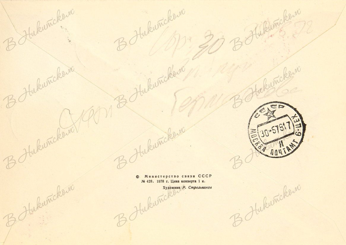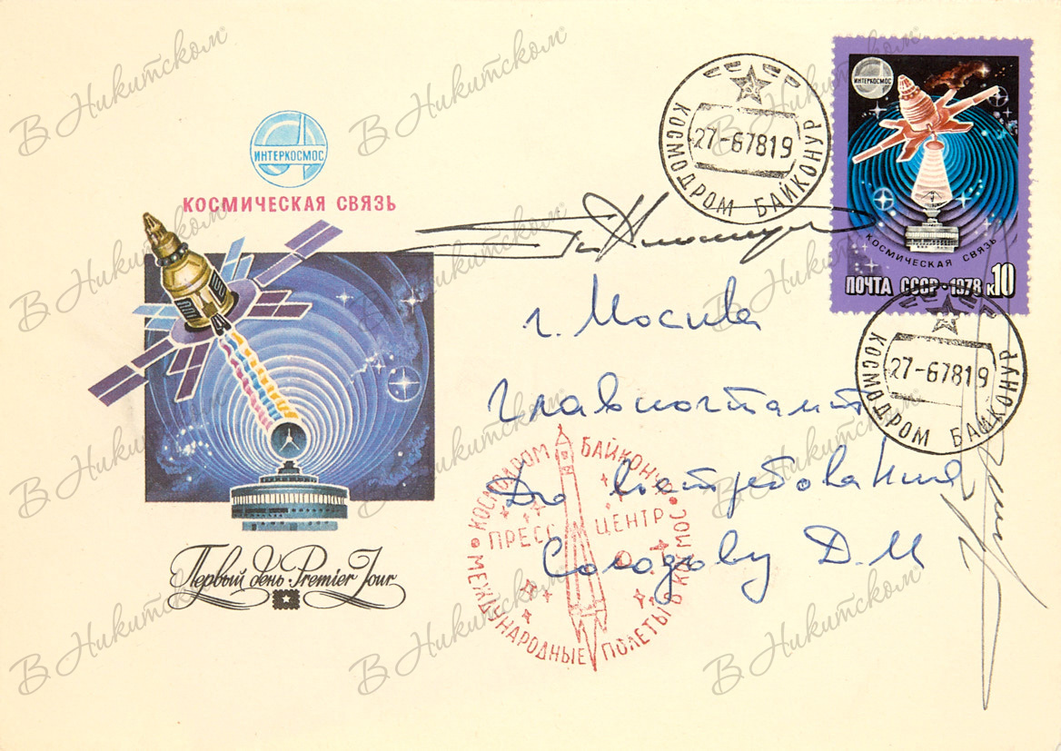 Климук, П., Гермашевский, М. [Автографы Д.М. Солодову]. Конверт первого дня «Космическая связь. Интеркосмос» с почтовой маркой. 1978.