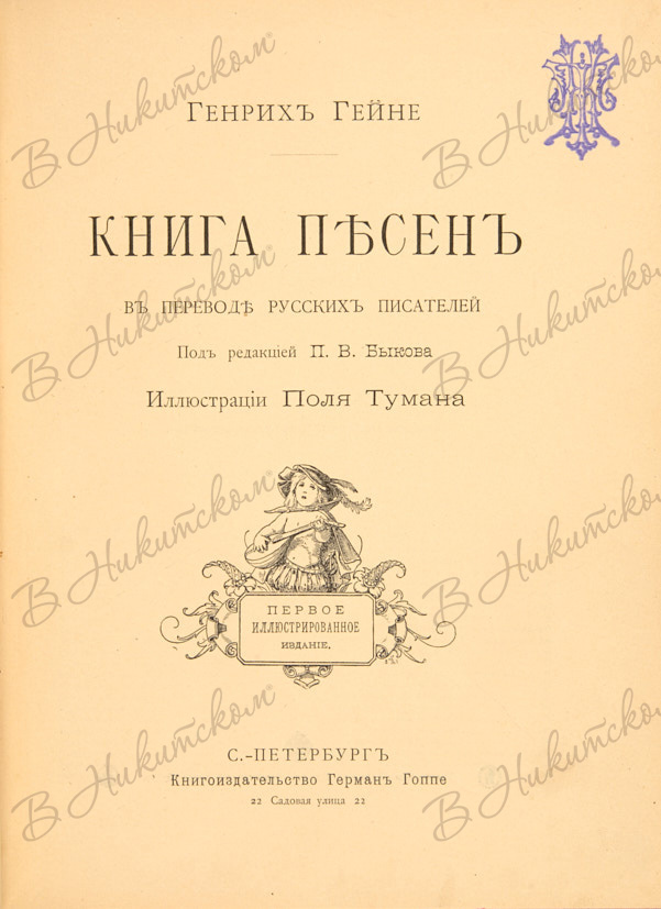 Гейне, Г. Книга песен в переводе русских писателей / под ред. П.В. Быкова; илл. Поля Тумана. 1-е иллюстрир. изд. СПб.: Книгоизд-во Герман Гоппе, 1893.