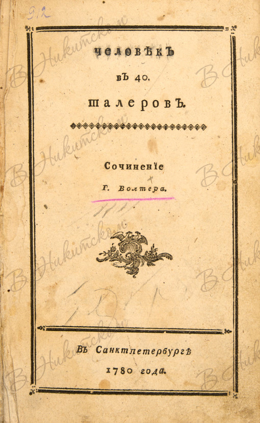 Вольтер, Ф-М-А, де. Человек в 40 талеров. СПб.: Тип. Акад. наук, 1780.