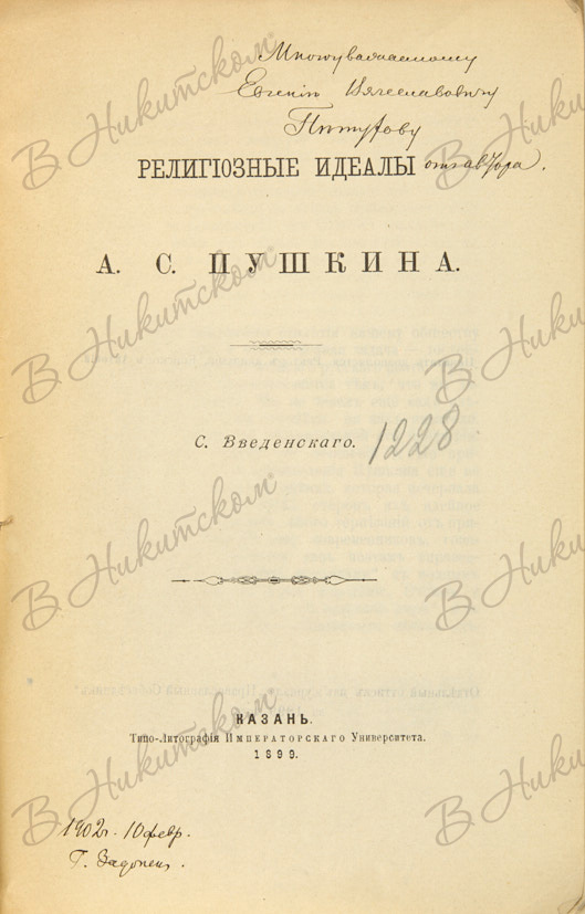 Введенский, С.Н. [Автограф]. Религиозные идеалы А.С. Пушкина. Казань: Типо-лит. Имп. университета, 1899.