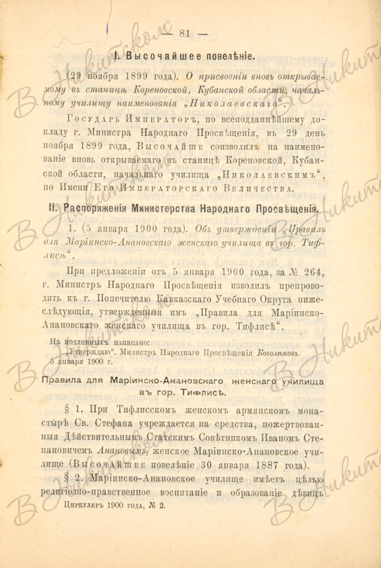 Циркуляр по управлению Кавказским учебным округом. №2 - февраль 1900 года. Тифлис: Тип. Канц. Главнонач. гражд.ч. на Кавказе, 1900.
