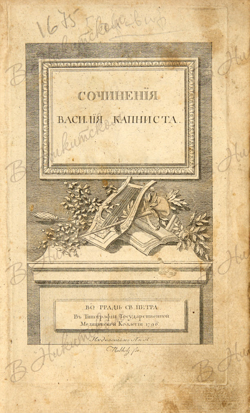Капнист, В. Сочинения. Во граде Св. Петра: В Тип. Государственной Медицинской Коллегии, 1796.