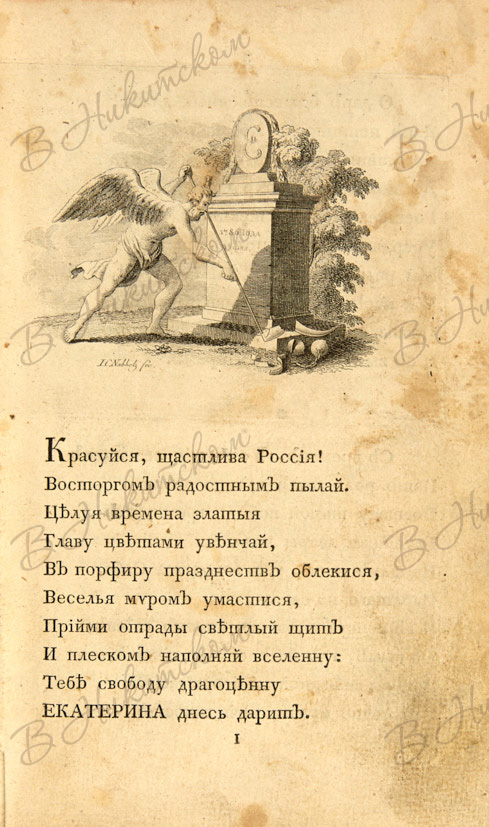 Иллюстрированный титульный лист и четыре очаровательные виньетки в тексте, гравированные И.Х. Набгольцем. В.А. Верещагин пишет: «самое редкое издание сочинений этого писателя». Первое прижизненное издание произведений В.В. Капниста.