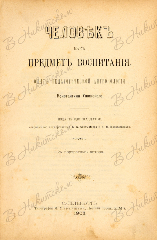 [Ушинский, К.]. Человек как предмет воспитания. Опыт педагогической антропологии Константина Ушинского. Издание 11-е, сокращённое под ред. К.К, Сент-Илера и Л.Н. (Вариантов нет). С портретом автора. СПб.: Типография М. Меркушева, 1903.