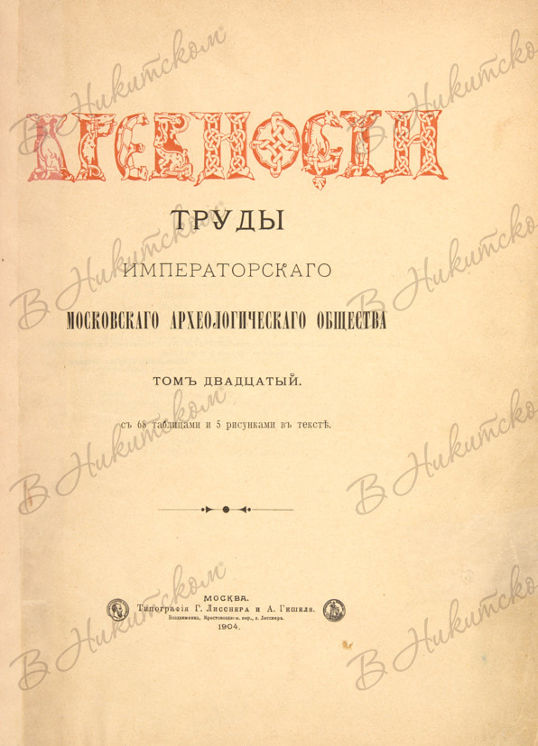 Древности. Труды Императорского Московского археологического общества / под ред. В.К. Трутовского. [В 25 т.]. Т. 20. М.: Тип. Г. Лисснера и А. Гешеля, 1904.