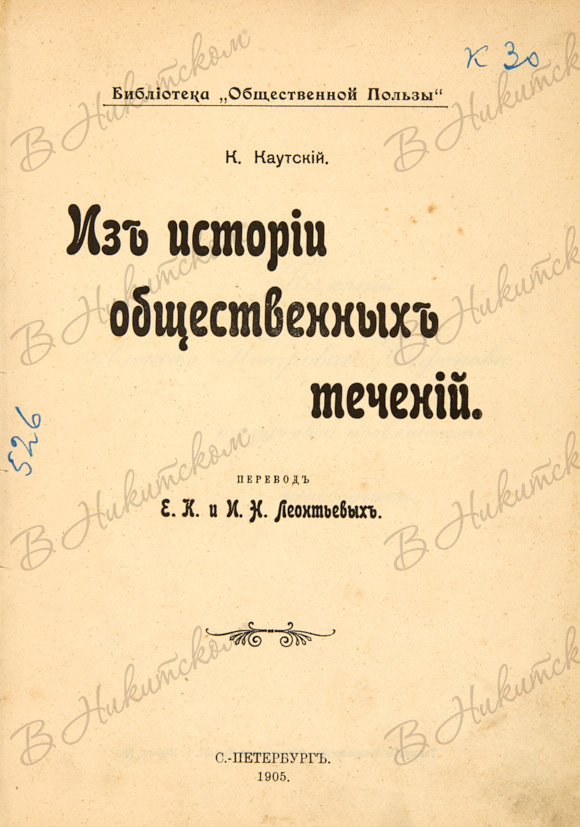 Каутский, К. Из истории общественных течений / пер. Е.К. и И.Н. Леонтьевых. СПб.: Общественная польза, 1905.