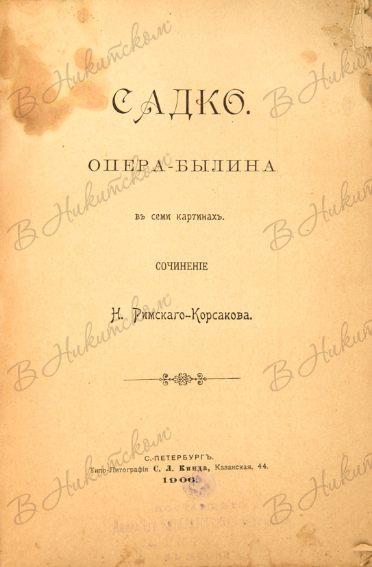 Римский-Корсаков, Н. Садко. Опера-былина в семи картинах. СПб.: Типо-Литография С.Л. Кинда, 1906.