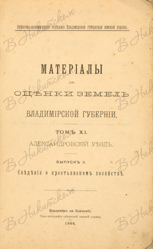 Материалы для оценки земель Владимирской Губернии. Т. 11. Александровский уезд. Вып. 2. Сведения о крестьянском хозяйстве. Владимир: Типо-литография губернской земской управы, 1906.