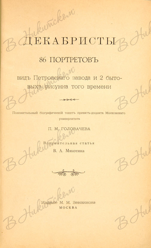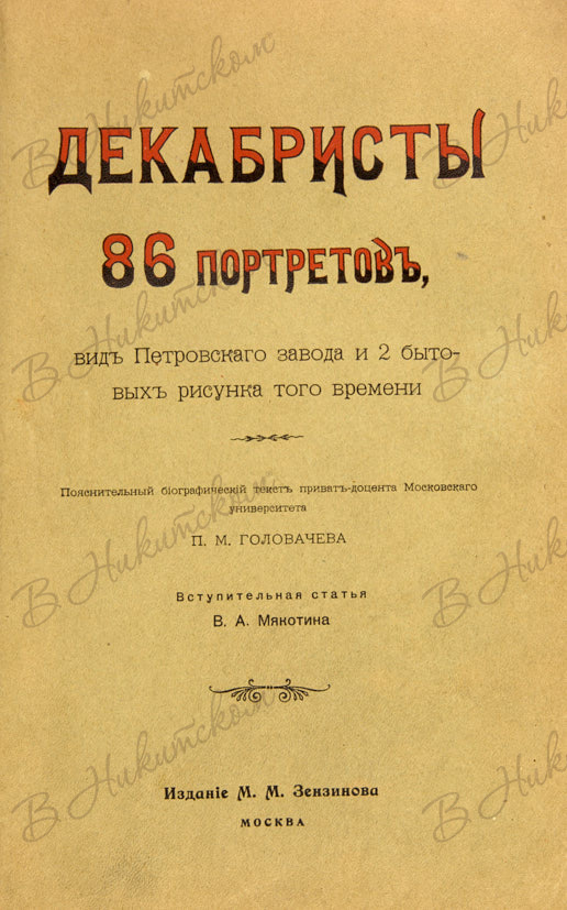 Декабристы. 86 портретов, вид Петровского завода и 2 бытовых рисунка того времени / пояснит. текст П.М. Головачева; вступ. ст. В.А. Мякотина. М.: Издание М.М. Зензинова: Типо-лит. Н.И. Гросман и Г.А. Вендельштейн; Фототип. К. Фишер, 1906.