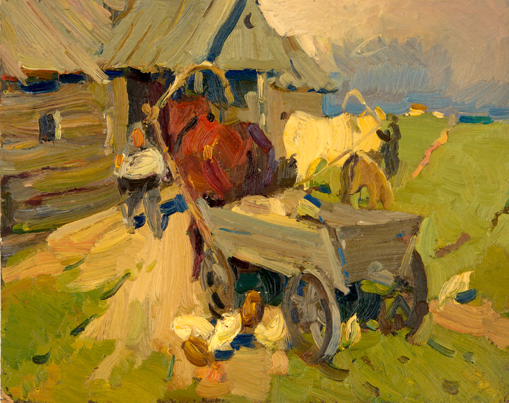 Пейзаж с телегами и жеребенком. 1950-е гг. Картон, масло, 22,5×28 см.