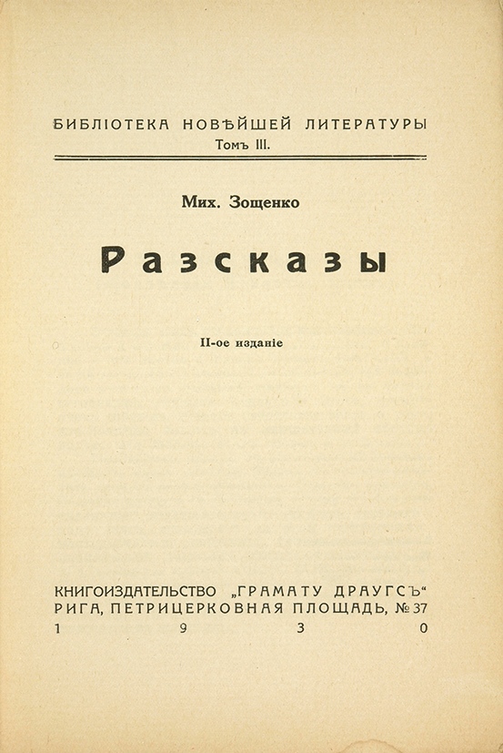 Зощенко, М. Рассказы. 2-е изд. Рига: Грамату Драугс, 1930.
