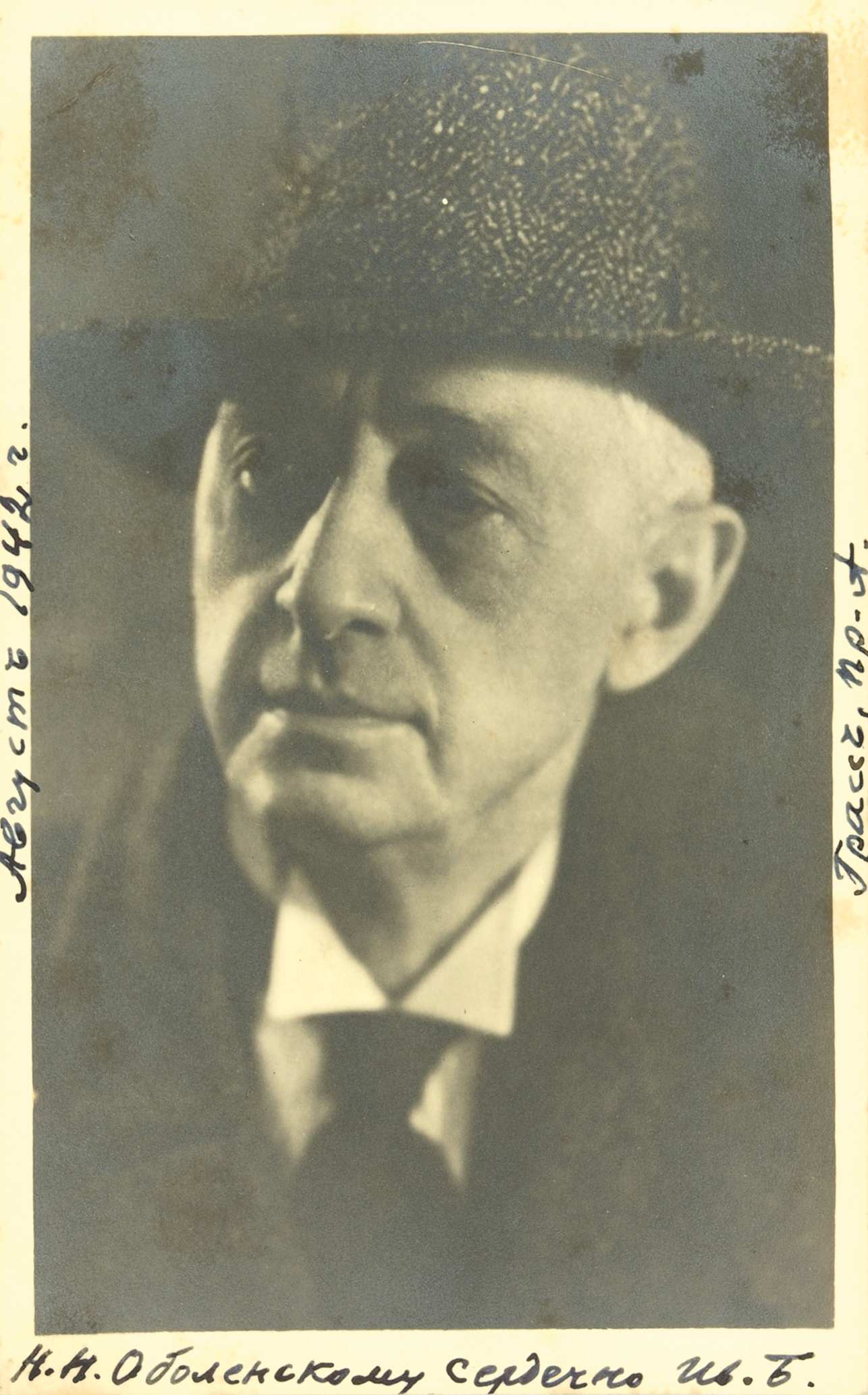 Из воспоминаний В.В. Лаврова: «Городок на речке Сене нам, советским людям, был доступен не больше, чем полет на Луну. Вот почему я крайне удивился, когда из почтового ящика, в который мог влезть всяк желающий, однажды извлек объемистое письмо из Парижа с иностранными марками и штемпелями. В конверте лежали газетные вырезки, касавшиеся Бунина, и фото самого классика. На лицевой стороне на узких светлых полях рукой Бунина написано: «Август 1942 г. Грасс, Пр/иморские/ А/льпы/. Н.Н. Оболенскому сердечно Ив. Б.». На обратной стороне Бунин начертал слова, которые любил повторять: «Счастье, дружок, как вода в бредне: тянешь - надулось, а вытащишь - ничего нету». Коротаев. - Пьеру. «Война и мир». Николай Николаевич со знатной фамилией Оболенский писал, что ему весьма импонирует мое изучение жизни и творчества Ивана Алексеевича и нравятся публикации о русской эмиграции. И как «дань этой признательности - фото Бунина», которое по мысли корреспондента могло «пригодиться для литературной работы».