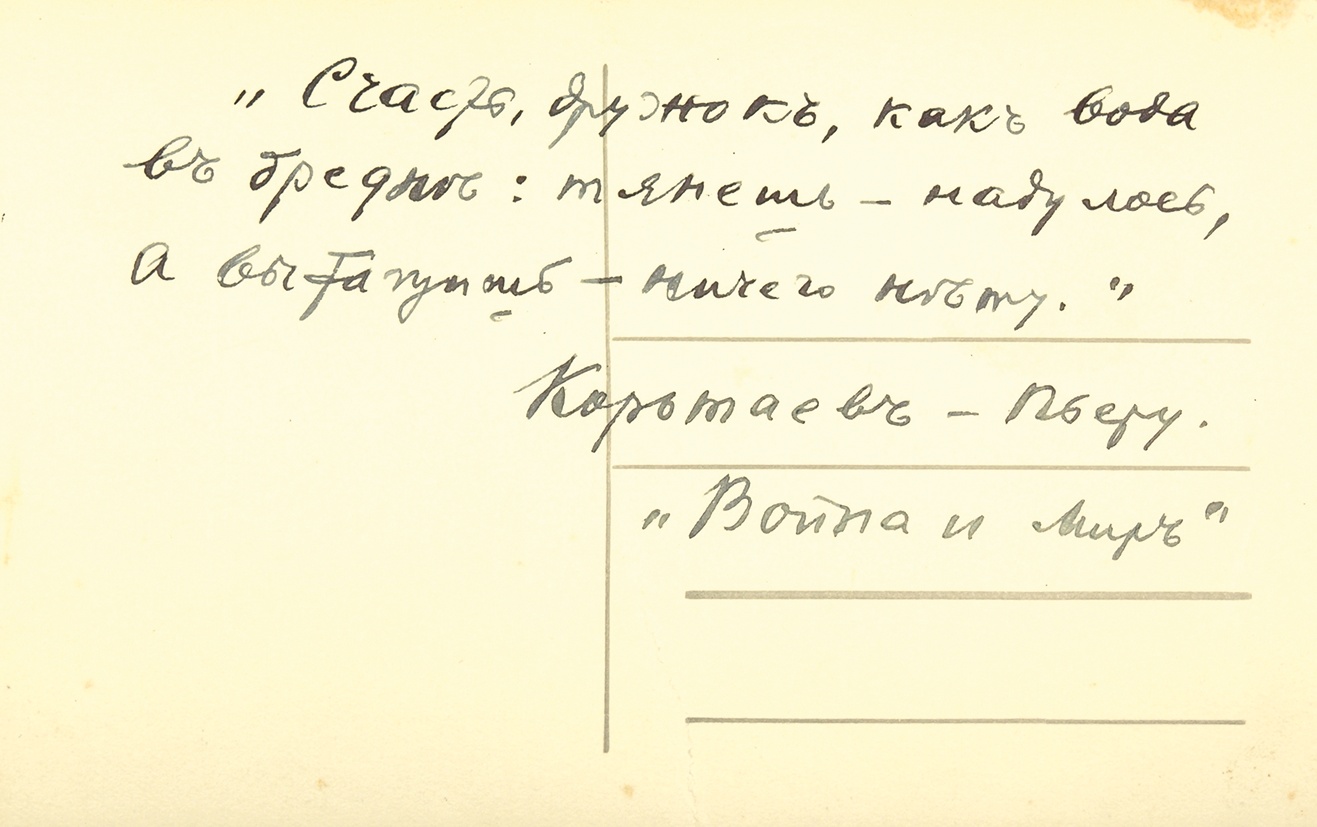 13,2 x 8,8 см. По периметру иллюстрированной стороны открытки: «Август 1942. Н.Н. Оболенскому сердечно Ив. Б. Грасс, пр-А.» . На обороте открытки продолжение записи: «счастье, дружок, как вода в бредне: тянешь - надулось, а вытащишь - ничего нету». Каратаев - Пьеру. «Война и мир» .