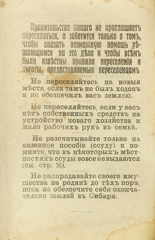 24 с. 22 х 16 см. Вероятнее всего, брошюра была издана без обложки. Представляет собой сборник ценных указаний для решившихся переселиться в Сибирь и на Дальний Восток и рассказывает о том, куда можно переселяться, где устроится, как поступать с надельными землями на родине, дает информацию о расходах и приводит список переселенческих пунктов.