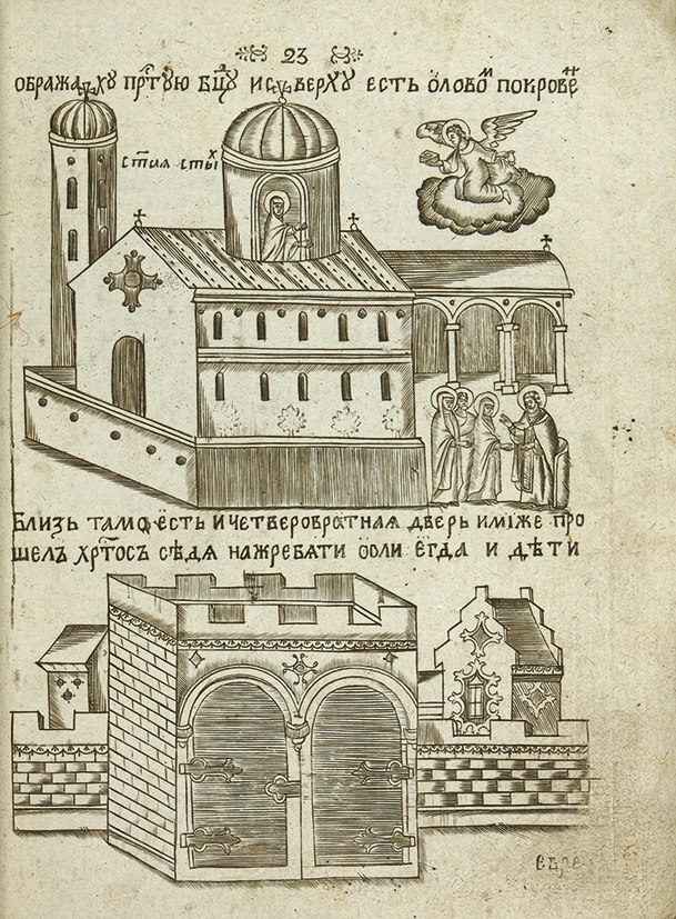 51 л., и л. 21,7 х 17,3 см. Во владельческой бумажной облатке (сохранен только фрагмент передней части) с кожаным корешком, прошитым нитью. Утрата фрагмента корешка. Следы заломов, заломы уголков некоторых страниц, следы залития, владельческие пометы. « Описание Святого града Иерусалима » - одна из самых популярных цельногравированных книг. Представляет собой копию, выполненную с венского издания 1748 года, выпущенного в мастерской Томаса Месмера. Текст составлен архмандритом Архангельского иерусалимского монастыря, служившим при Святом Гробе Господнем. Изображения нарисованы и гравированы Христофором Жефаровичем - сербским художником и гравером. Жефарович скончался в 1753 году в Москве, что способствовало проникновению книги в России. Русские мастера скопировали это произведение изменив масштаб иллюс траций. Издание 1771 года было создано на 13 досках в четвертую долю листа. Популярность издания в XIX в., выдержавшего множество переизданий, затрудняет его атрибуцию. Методику работы с цельногравированными изданиями «Описания Иерусалима» разработали С.А. Клепиков и О.Р. Хромов, выделяя особые типы, варианты и издания. Наше издание относится к типу I, варианту I, изданию 2. Хромов, «Цельногравированная книга и гравюра...», с. 100, Обольянинов № 1920.