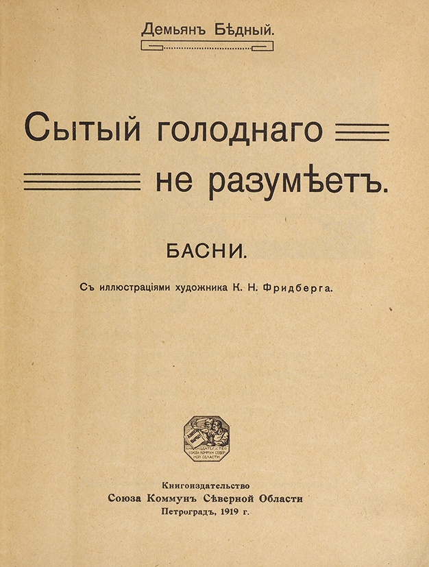Бедный, Д. Сытый голодного не разумеет. Басни / ил. К. Фридберга. Пг.: Книгоиздательство коммун северной области, 1919.