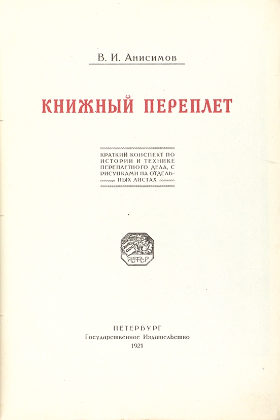 Анисимов, В.И. Книжный переплет: Краткий конспект по истории и технике переплетного дела, с рисунками на отдельных листах / В.И. Анисимов; обл. и страничные украшения раб. А.Н. Лео. Пг.: Госиздат, 1921.