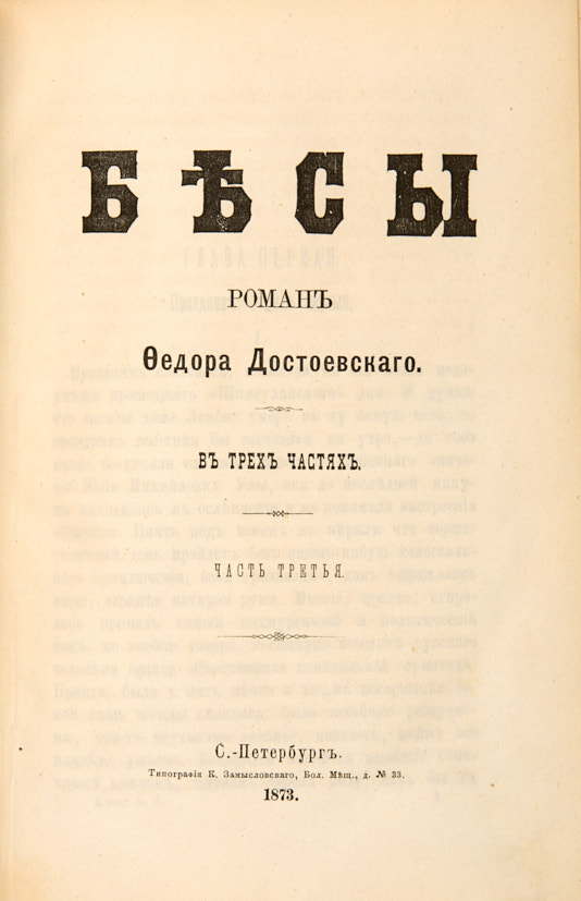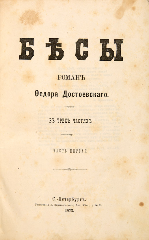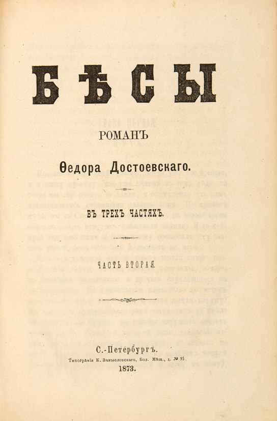 [Первое отдельное издание]. Достоевский, Ф.М. Бесы. Роман Федора Достоевского. В 3 ч. Ч. 1-3. СПб.: Тип. К. Замысловского, 1873.